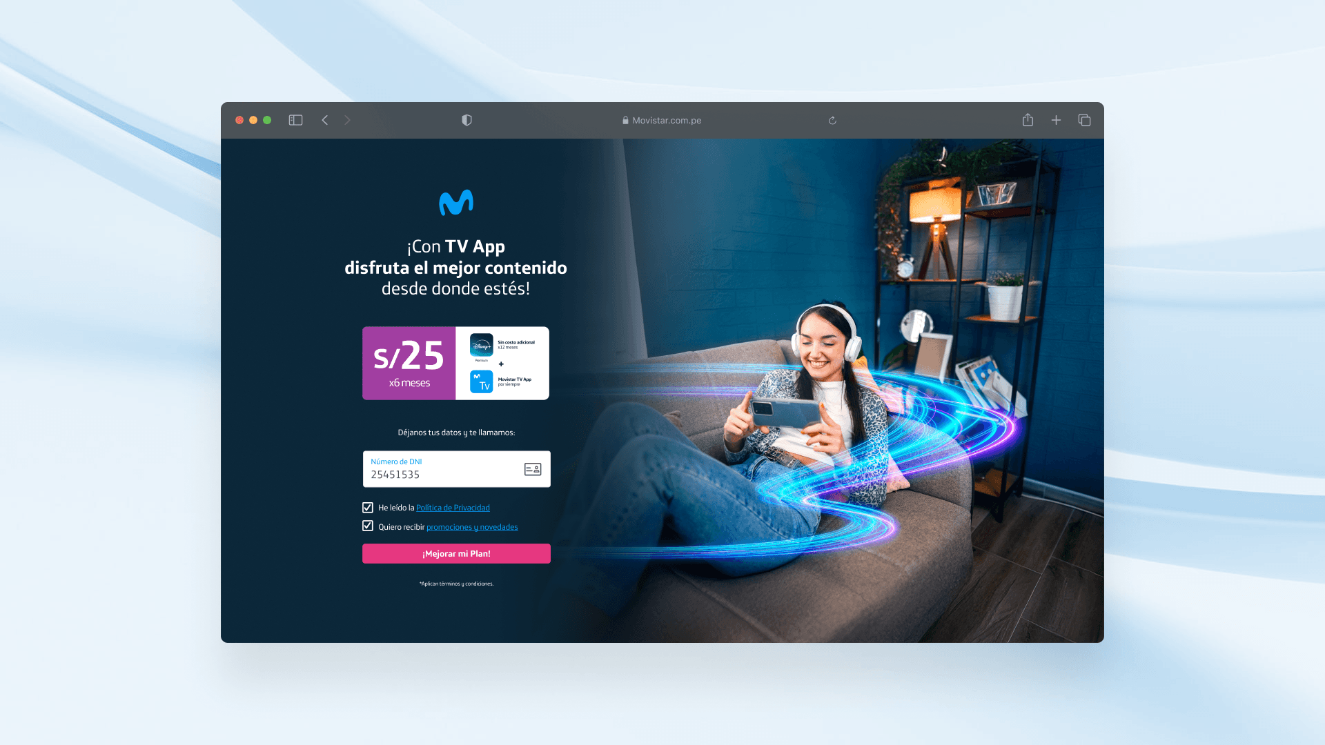 Se diseñó una landing page accesible para clientes y no clientes, enfocada en comunicar de forma clara las promociones disponibles para adquirir Movistar o mejorar su plan, utilizando los recursos visuales de la marca para lograr un diseño atractivo, coherente y libre de distracciones.