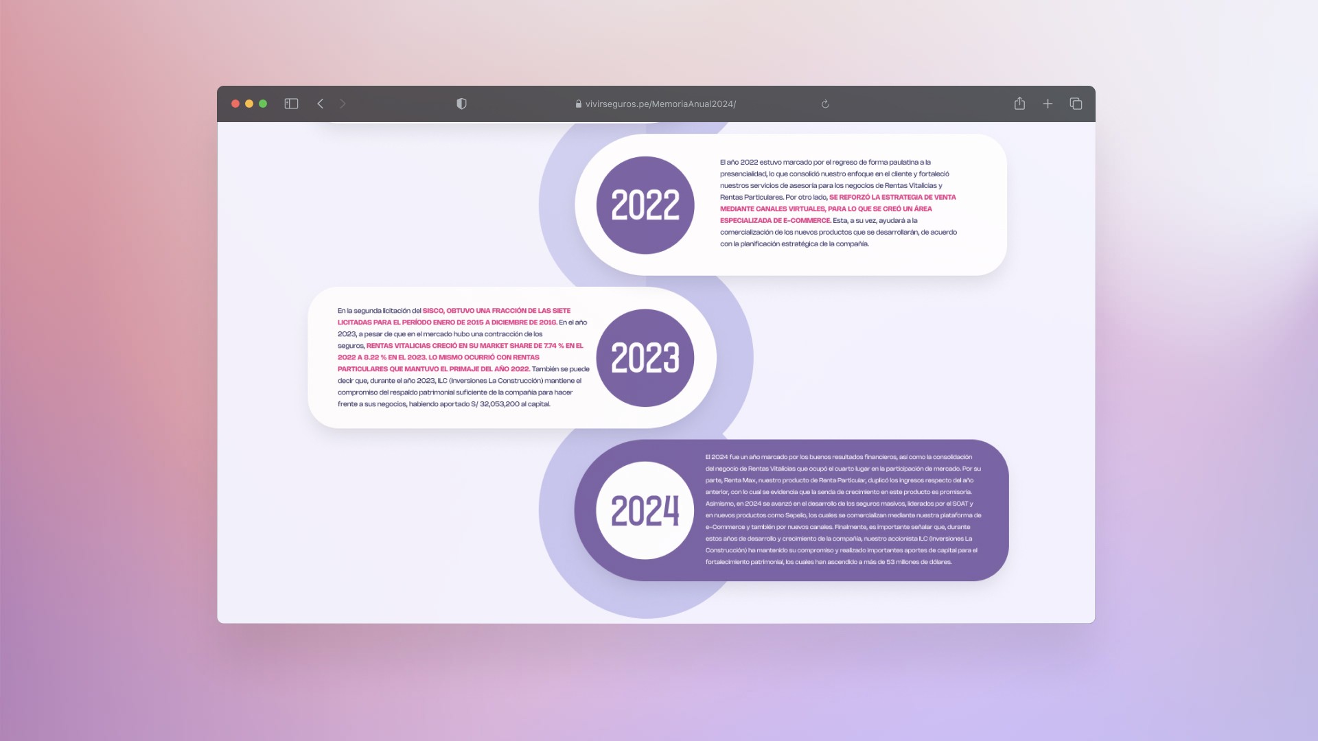 En esta landing se presenta el recuento de las principales acciones realizadas por Vivir Seguros durante el año 2024. Se buscó crear una interfaz intuitiva y creativa que permitiera comunicar la información de manera eficiente, destacando la historia de la empresa y su gestión a lo largo del año, a través de una experiencia clara, atractiva y centrada en el usuario.